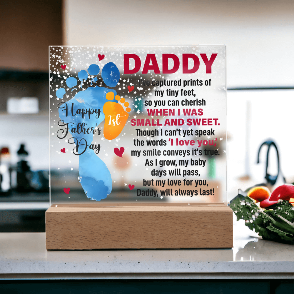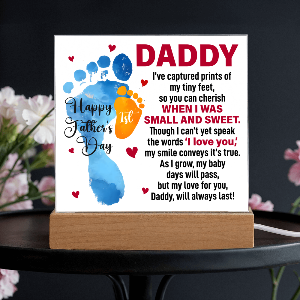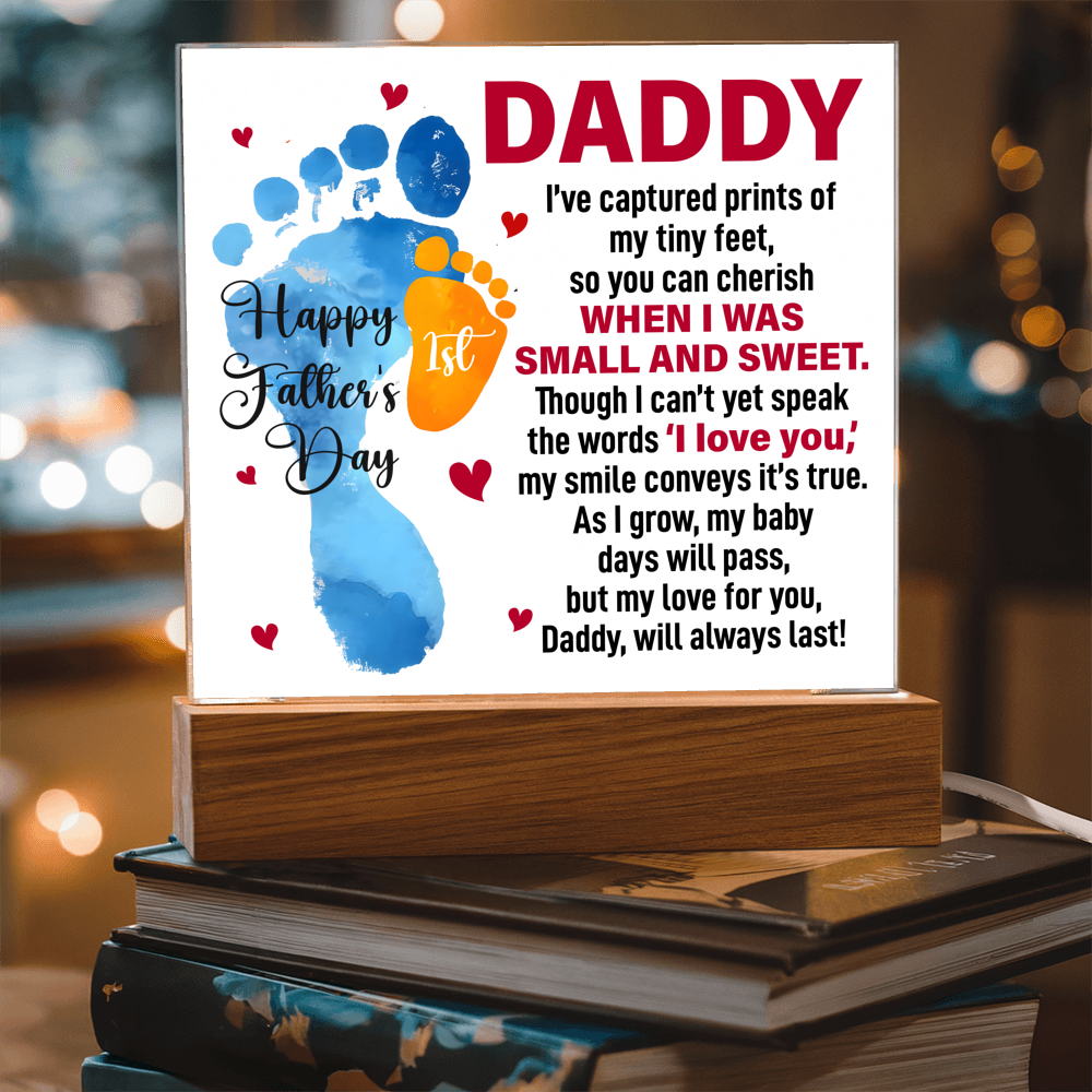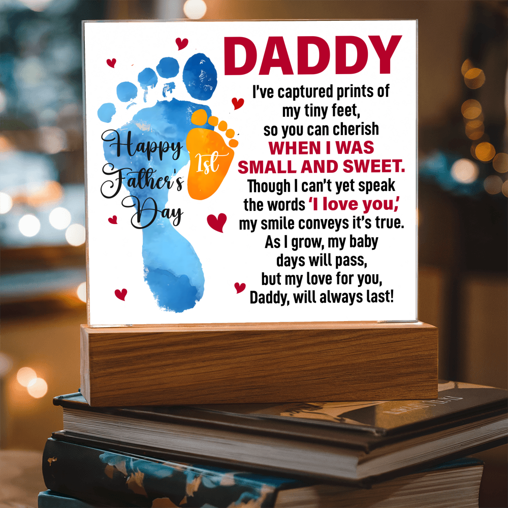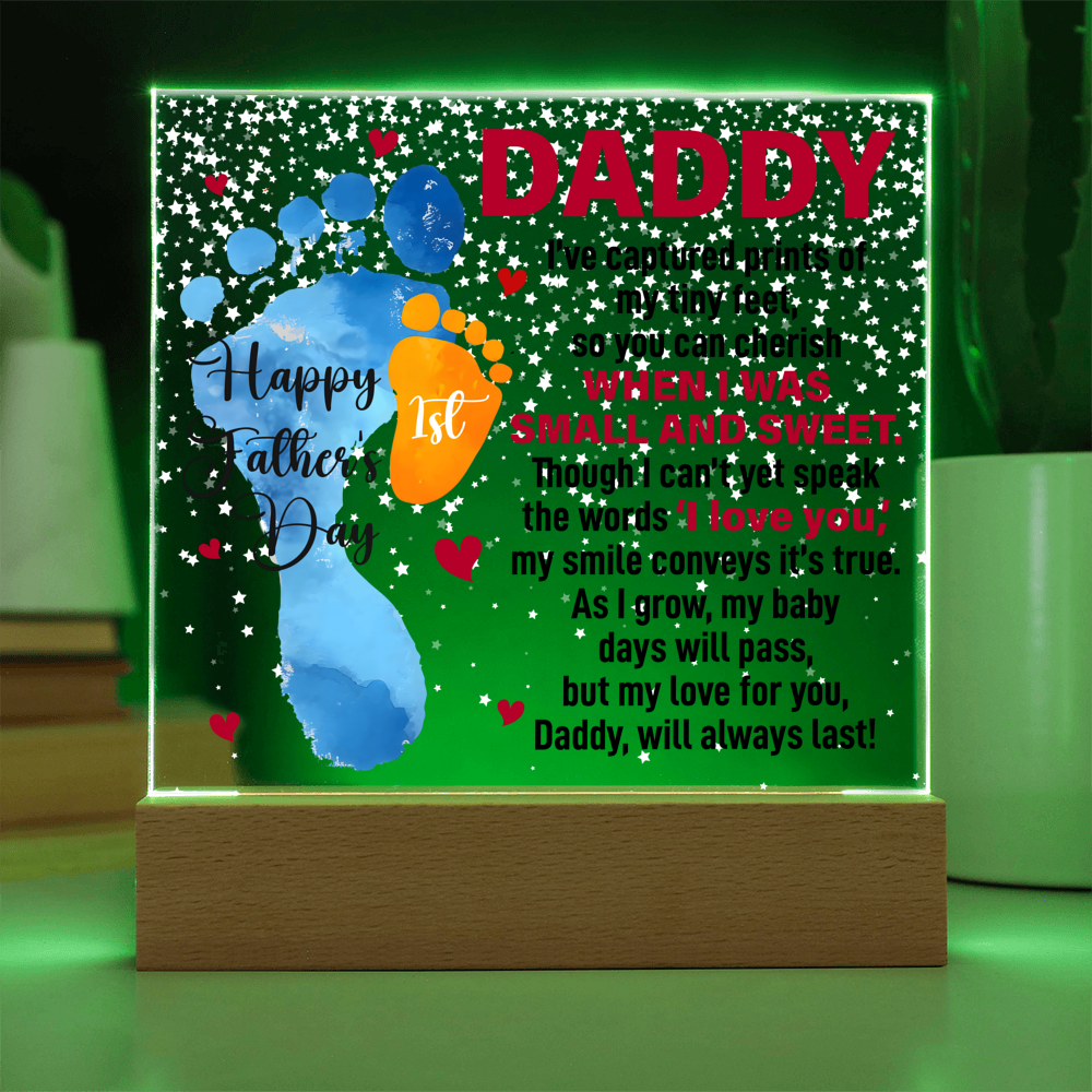 Your plaque will be crafted from premium acrylic with a professionally printed design for a polished look. It comes with a stylish wooden LED base, and you can choose between a USB plug-in option OR a cordless battery-operated option (requires 2 AAA batteries, not included). Both LED bases feature 7 vibrant colors, allowing the user to customize the lighting with various color changes and dynamic cycles.