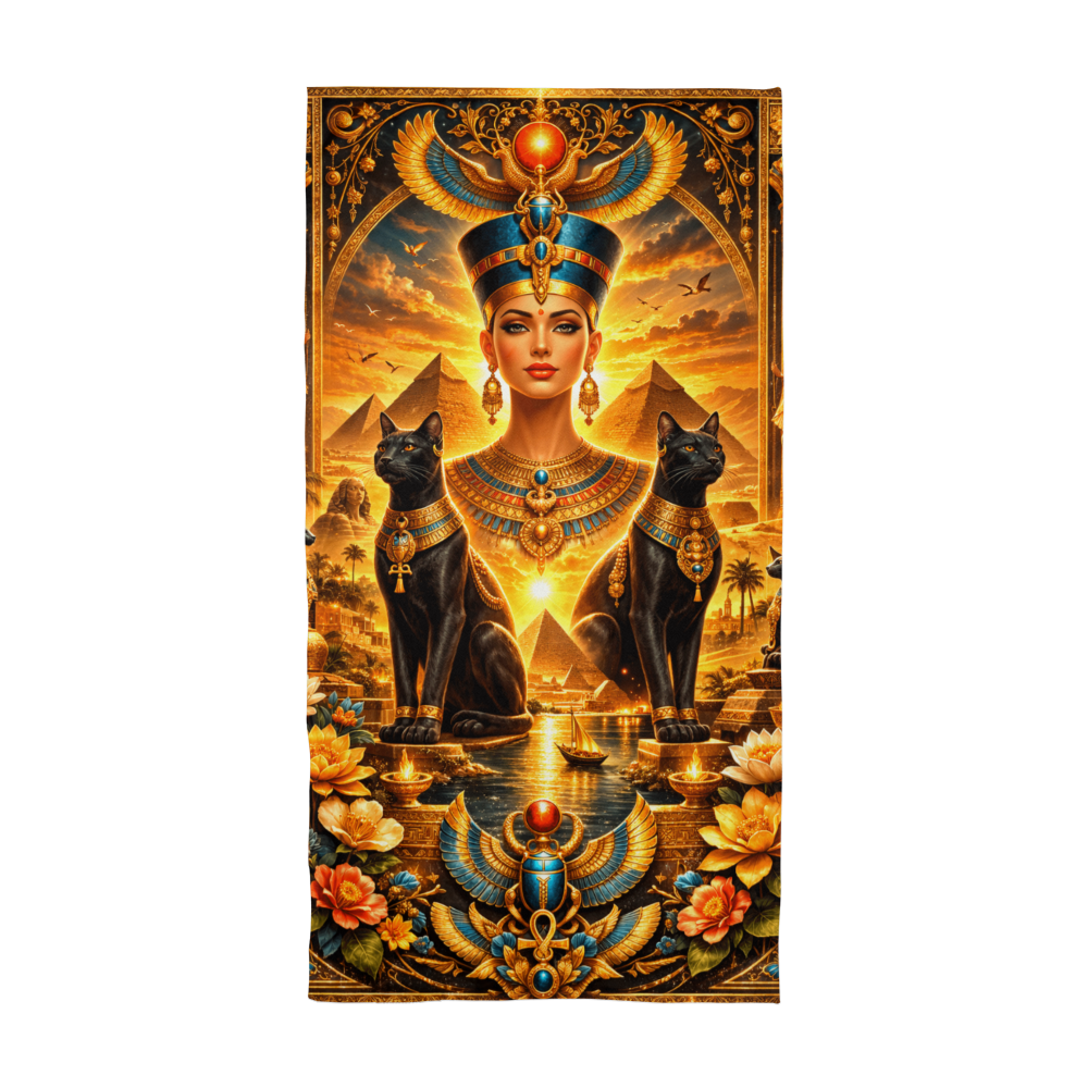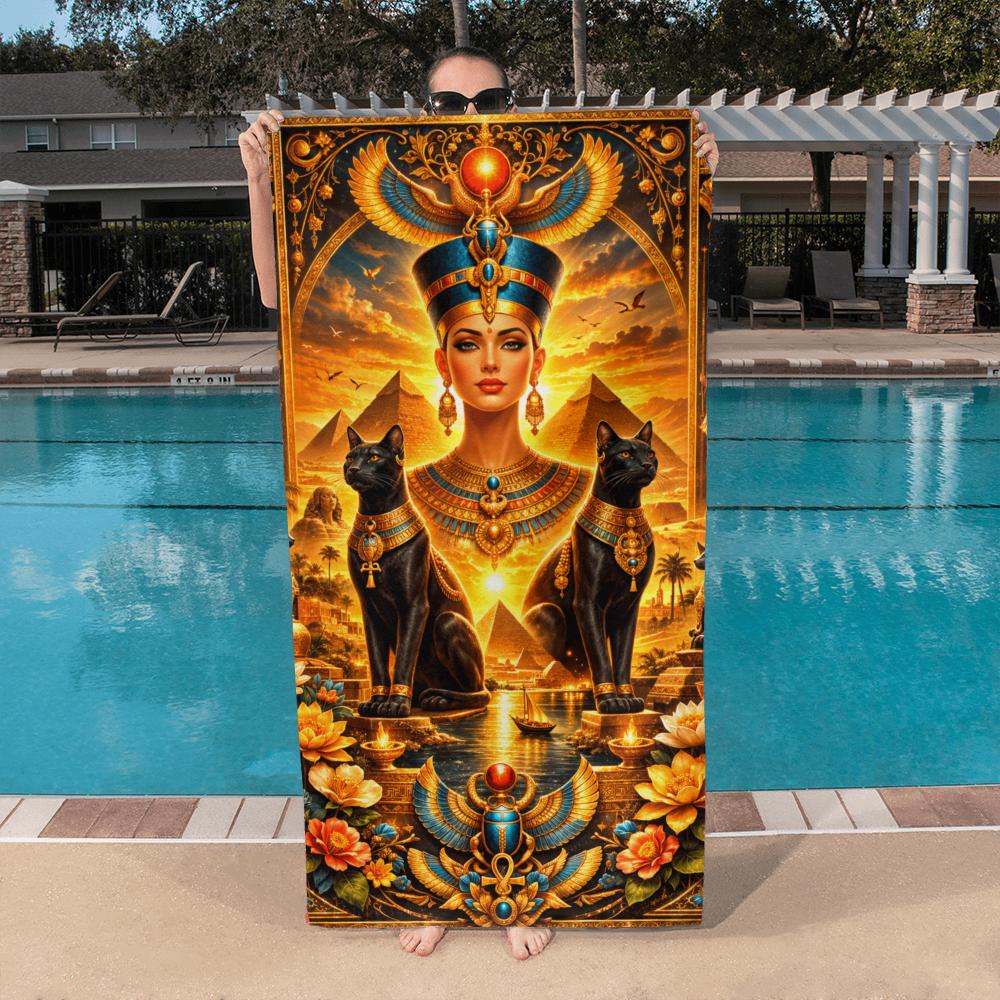 Wrap yourself in timeless luxury and step into the grandeur of ancient Egypt with the Majestic Egyptian Royal Beach Towel. This stunning design captures the elegance of a regal queen inspired by Nefertiti, surrounded by golden hieroglyphics, sacred symbols, and majestic black cats - guardians of mystery and power. The rich, radiant tones and intricate details create a truly premium, eye-catching statement wherever you go.